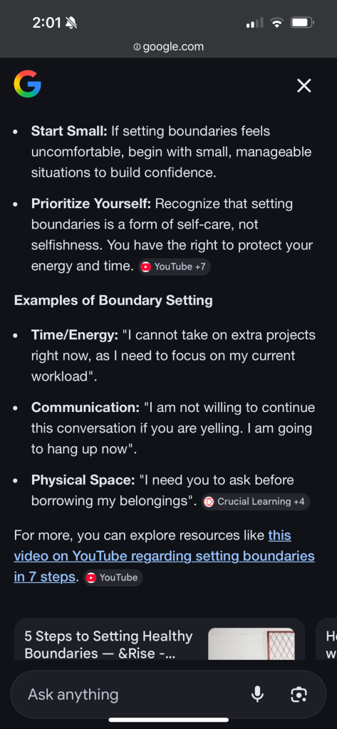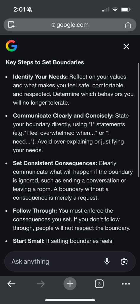 Each time you speak up and set a boundary you tell yourself you actually give a shit about your preferences! So self honoring of you! Lol we weren’t taught something that should be so natural. So take baby steps! Be patient with yourself and nonjudgmental! Hold yourself if insecurity arises. Your grace to yourself will carry you through!